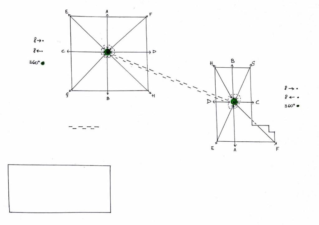 Austėjos brėžinyje pavaizduotas pirmasis kvadratas iliustruoja salę, o antrasis – koridoriaus erdvę.